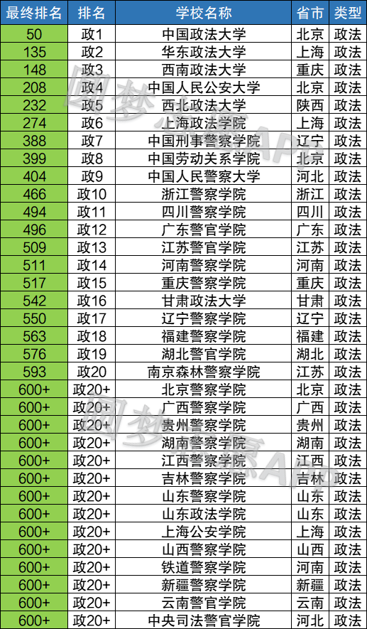 中国政法大学(50)、华东政法大学(135)、西南政法大学(148)、中国人民公安大学(208)、西北政法大学(232)、上海政法学院(274)、中国刑事警察学院(388)、中国劳动关系学院(399)、中国人民警察大学(404)、浙江警察学院(466)。