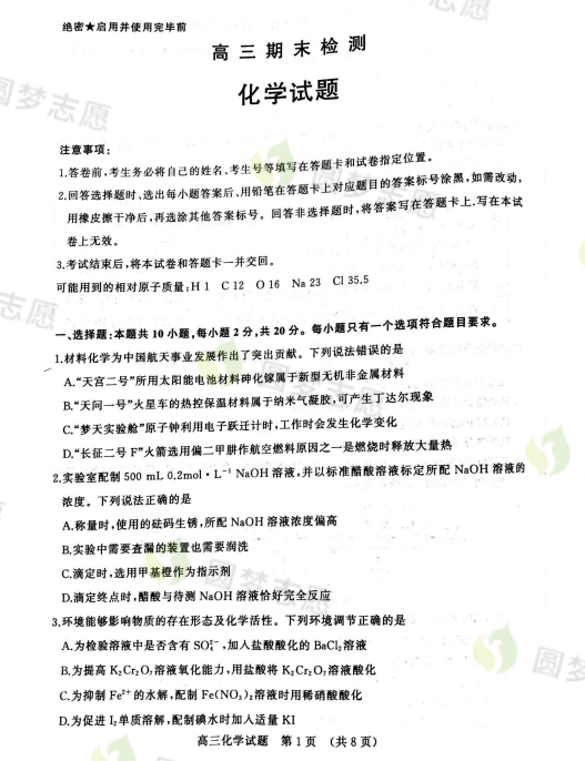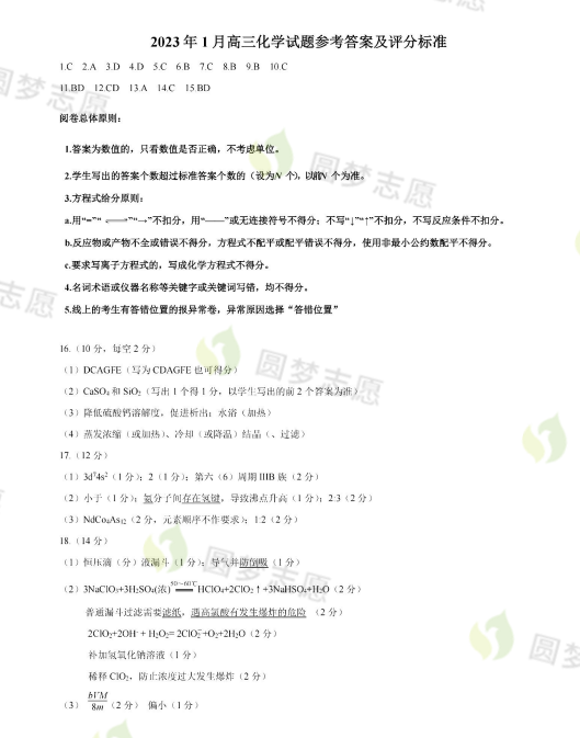 以下就是2023年度山东省济南市高三期末考化学科目的试卷试题以及参考答案解析,供大家复习参考。
