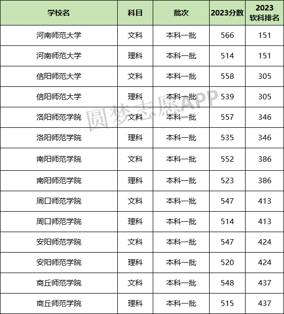 下表为2023年河南省各一本师范大学的排名和录取分数,各位可以在圆梦志愿app测评被河南各大学的录取概率。