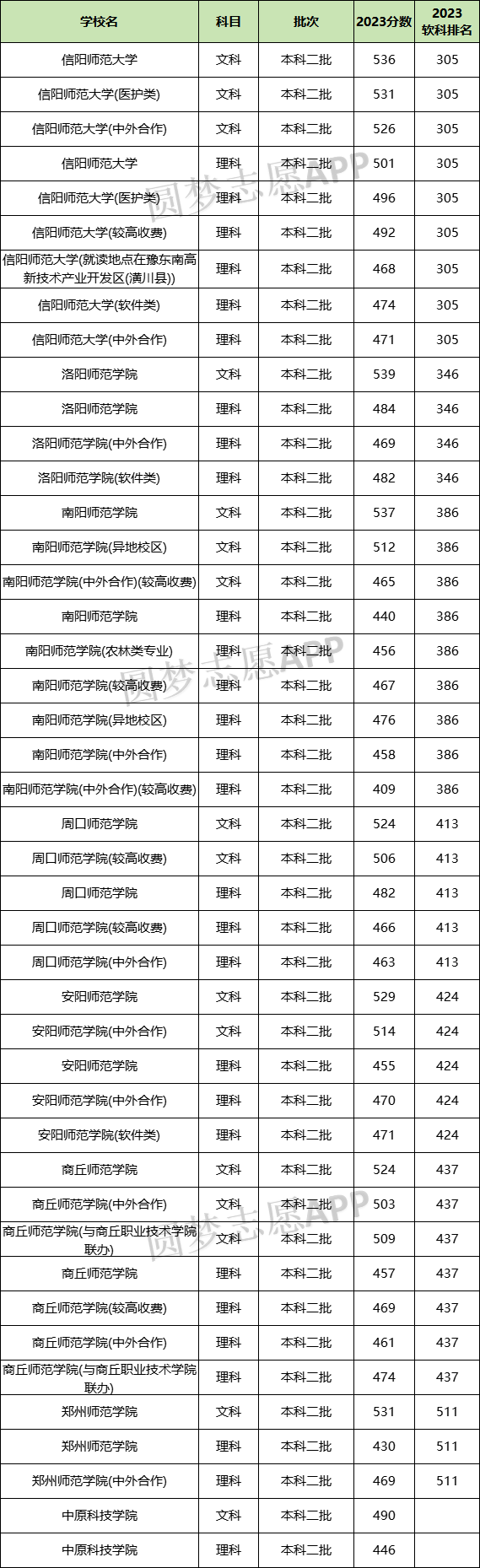 下表为2023年河南省各二本师范大学的排名和录取分数