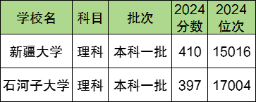 2024年新疆双一流大学理科本科一批最低录取分数线是390分,收分最低的学校是石河子大学,最低分397,对应最低位次是17004名。也就是说对于理科考生来说,高考成绩最低需要高于本科一批线7分,省排位在17004名以内才有机会上双一流大学。