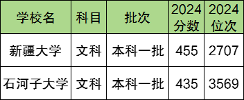 文科分数线最高、最难考的是新疆大学,2024年最低分455,最低位次2707。