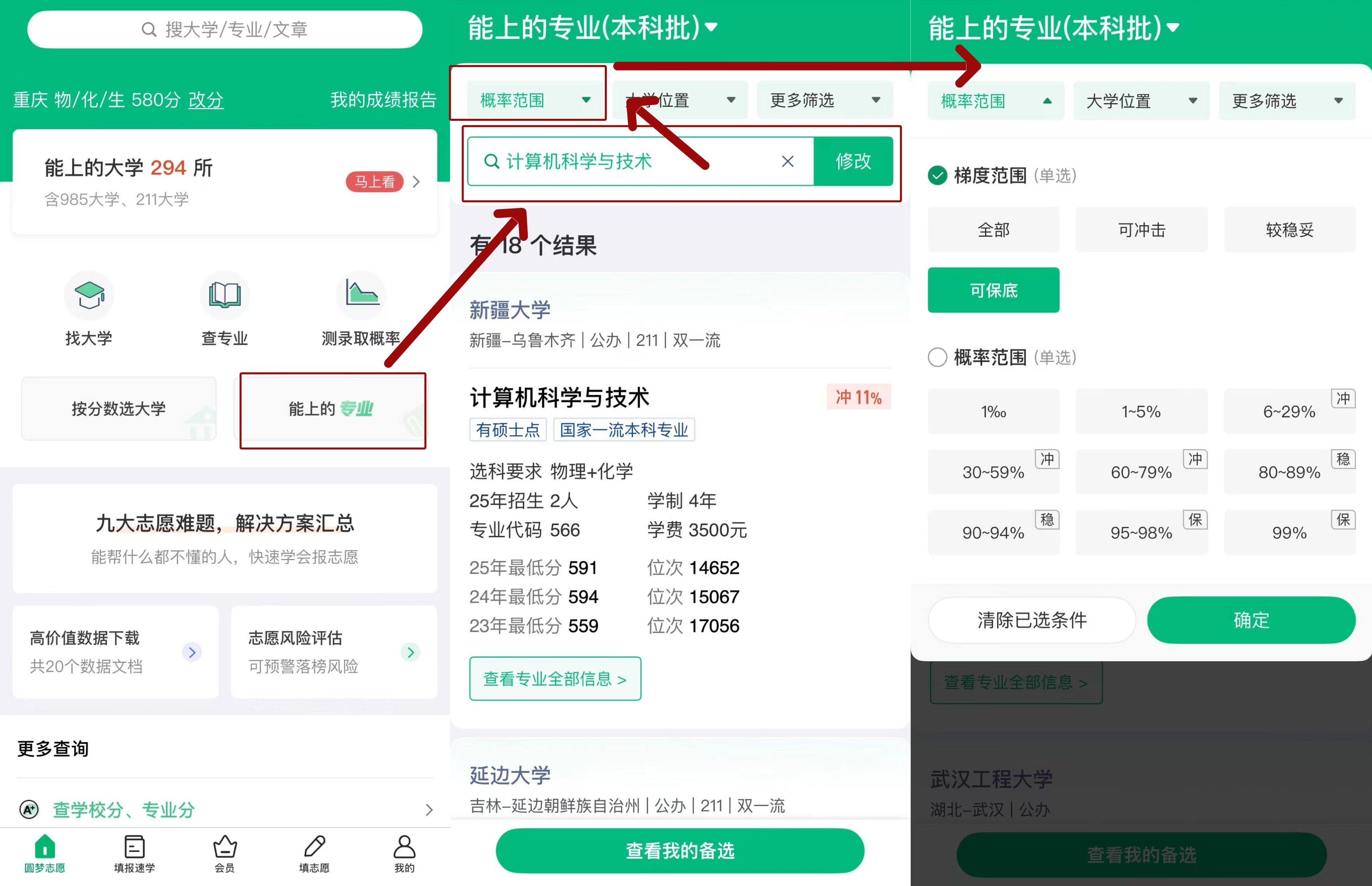 操作路径:在圆梦志愿APP首页点击【能上的专业】功能,输入“计算机科学与技术”即可查看对应院校列表。