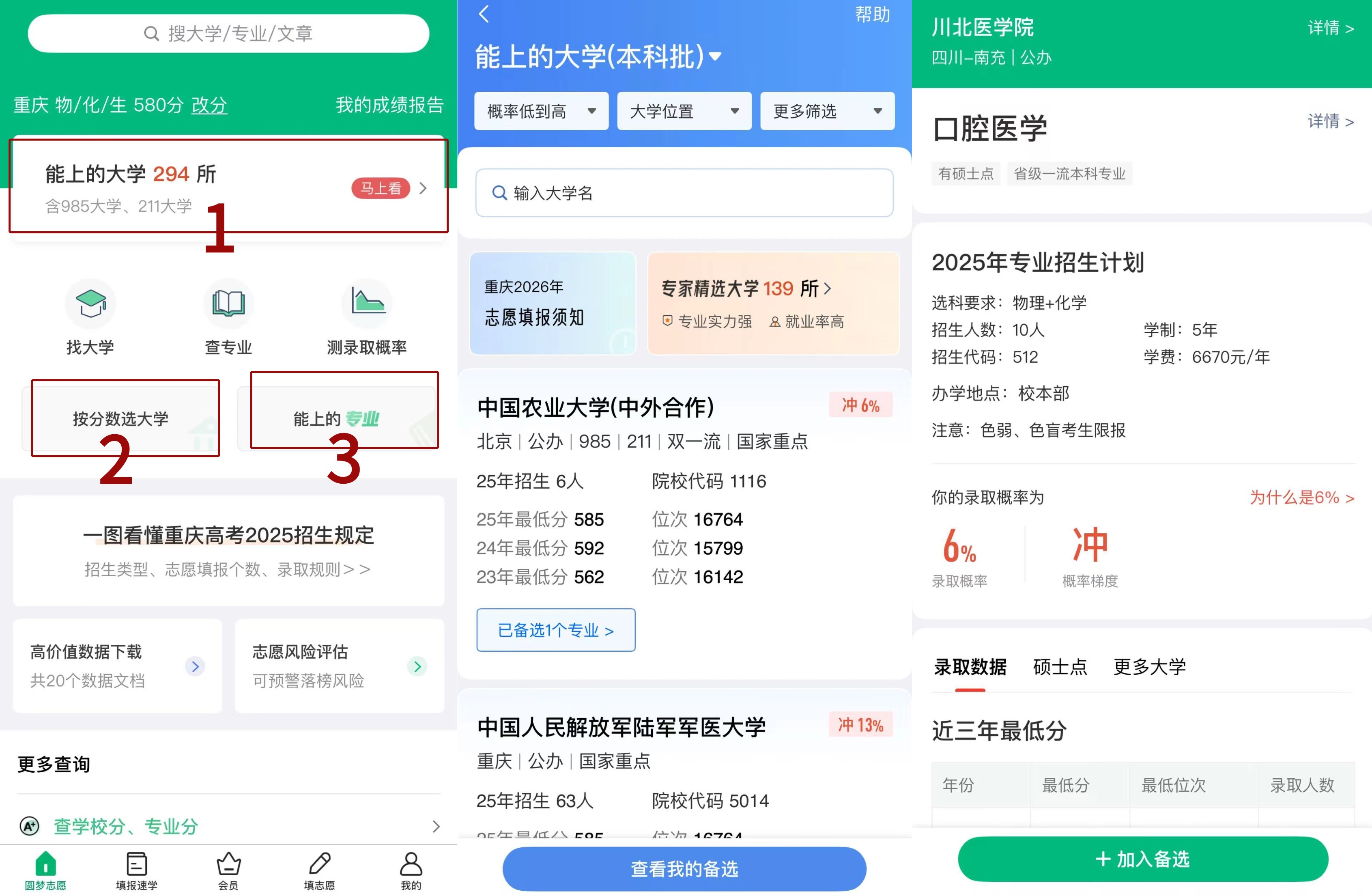 ①通过【能上的大学】、【能上的专业】、【按分数选大学】等功能筛选目标院校与专业并加入备选列表;
