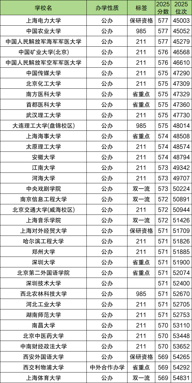 2025年高考5万名左右对应的分数线是569分到577分,能上的最好大学是中国农业大学,2025年最低录取位次是45052名,属于5万名左右可以冲一冲的学校。能上的分数线最低的大学是上海体育大学,2025年最低录取位次是54831名,属于5万名左右比较稳妥的学校。