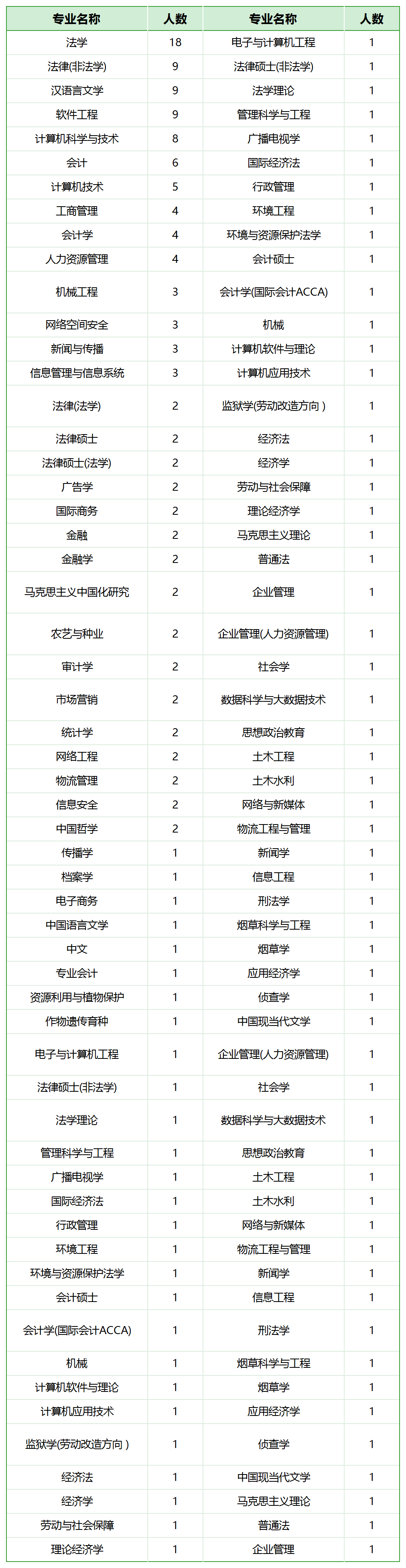 从专业背景看,法学相关专业毕业生占比最高。除此之外,烟草公司招聘人数最多的8个专业还包含法学18人、法律(非法学)9人、汉语言文学9人、软件工程9人、计算机科学与技术8人、会计6人、计算机技术5人。其中,工商管理、会计学和人力资源管理均招聘4人。