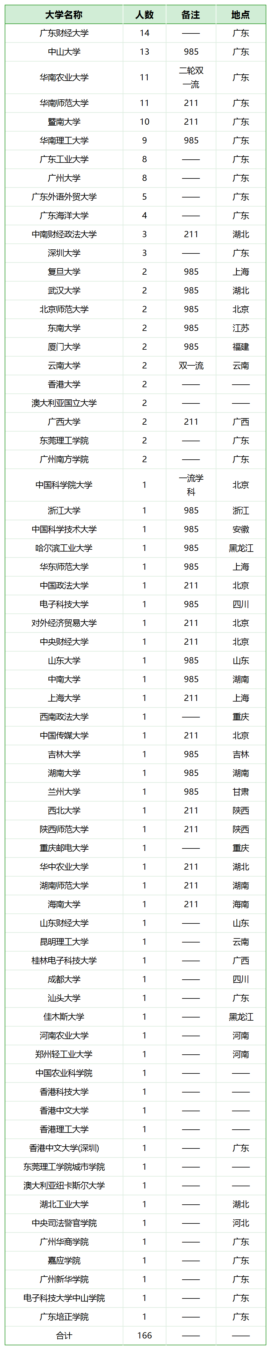 可以看到,在招聘的68所高校中,能进广东烟草工作的部分毕业生是985和211高校,其中,985大学共有17所,纯211大学共有14所。此外,前十的广东财经大学、华南农业大学、广东工业大学、广州大学、广东外语外贸大学、广东海洋大学都不是985和211大学。