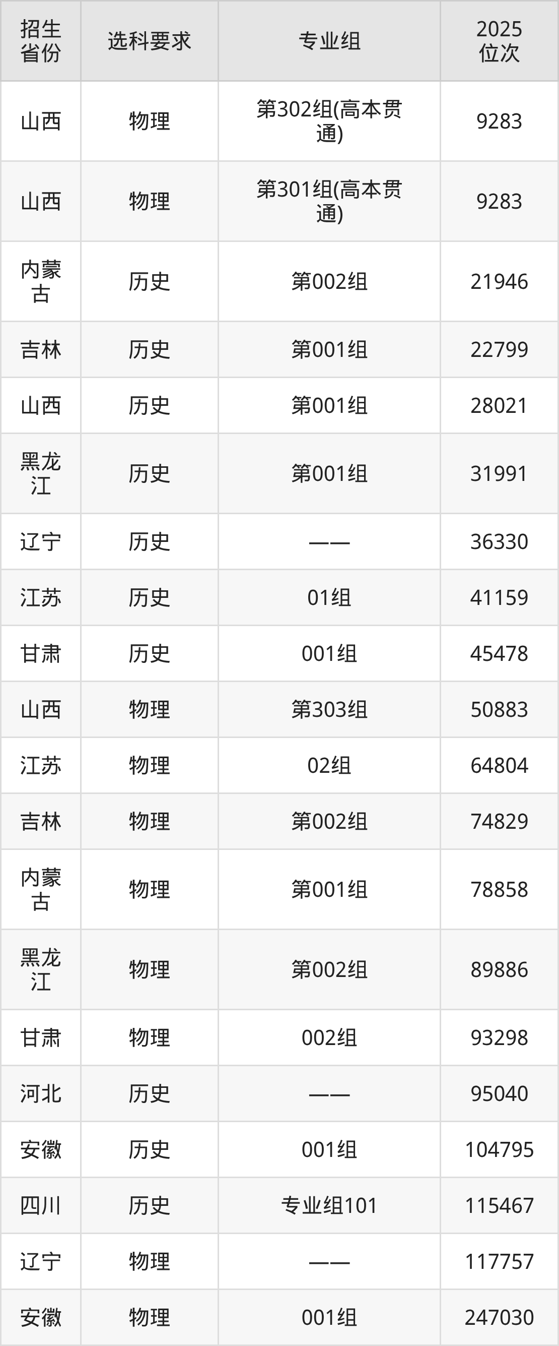 山西职业技术学院2025年在全国各省的位次差异较大,最高位次是9283位(山西物理类)、最低位次是339802位(山东)。各省具体位次请看下图: