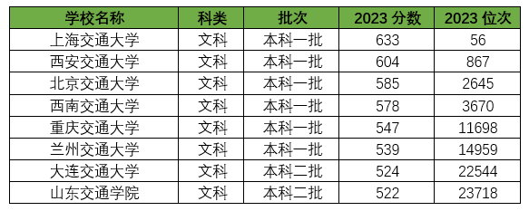 华东交通大学2023年未在四川文科招生外,其余院校都有招生,文科录取分数最高的是上海交通大学633分,文科录取分超过600分的还有西安交通大学,录取分数为604分;录取分数最低的是山东交通学院522分,是在本科二批录取,在该批次录取的还有大连交通大学,录取分数为524分。