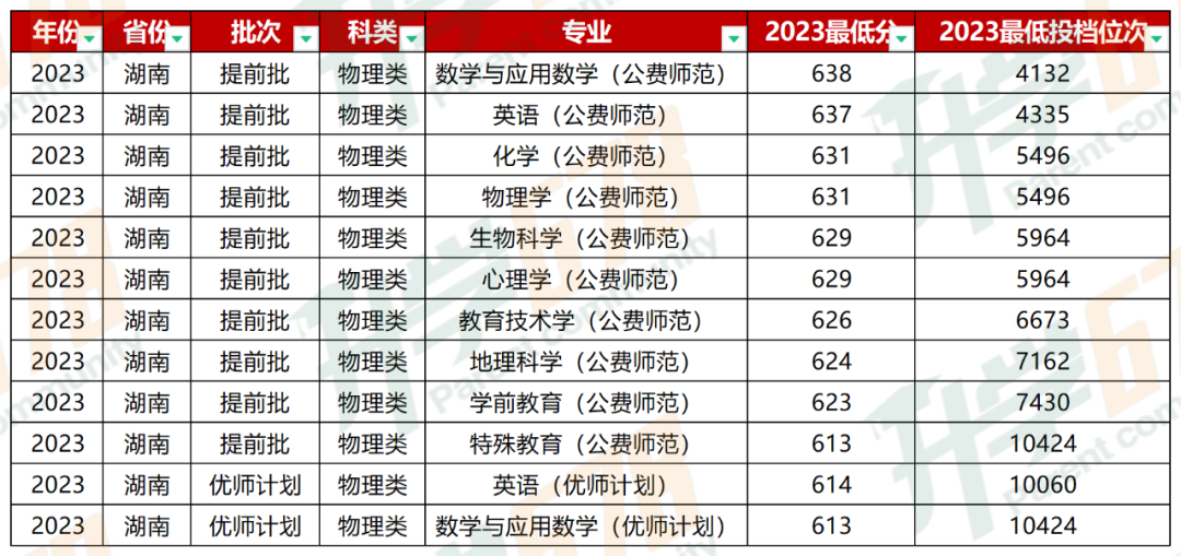 2023年华中师大在湖南物理类提前批最低录取分613分,对应位次10424,对应专业为特殊教育(公费师范)和数学与应用数学(优师计划)。而物理组提前批招生最高的专业为化学(公费师范),最高分为638分,对应位次4136,与最低录取位次足足相差25分。