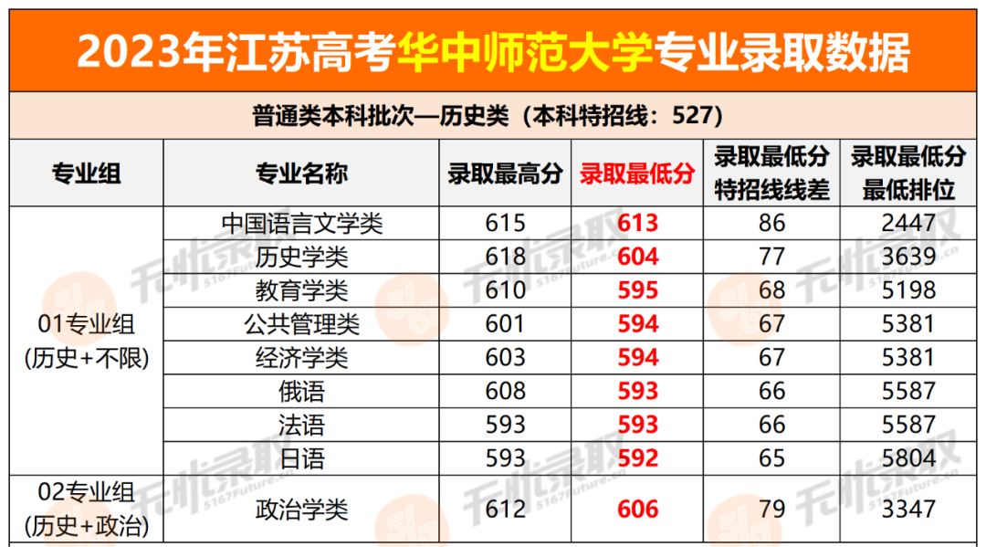 2023年华中师范大学在江苏历史类录取分数线最低的专业为日语,录取分数592分;对应录取位次5804名;录取分数线最高的专业为中国语言文学类,录取分数613分,超过了本科特招线86分,对应录取位次2447名;