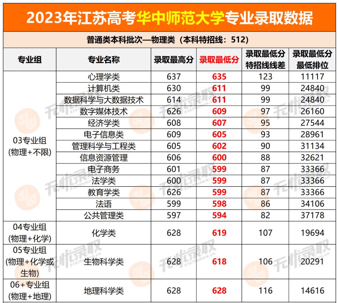华中师范大学在江苏物理类录取分数线最低的专业为公共管理类,录取分数594分,对应录取位次37178名;录取分数线最高的专业是心理学类,录取分数635分,超过了本科特招线123分,对应录取位次11117名;