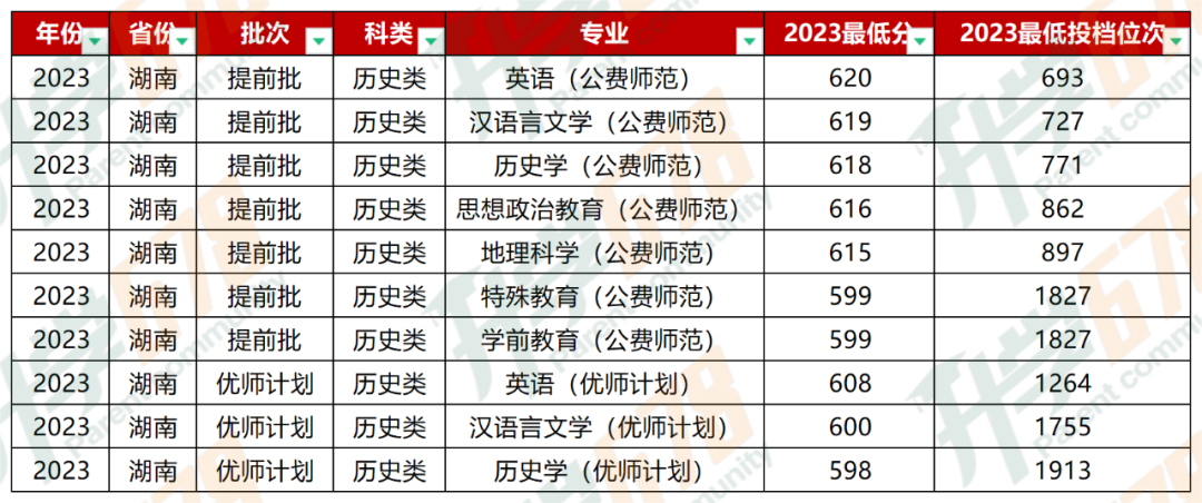 2023年华中师范大学在湖南历史类公费师范生最低录取分数线为599分,对应专业是学前教育,录取位次1827名;分数线最高的专业是英语,录取分数为620分对应录取位次693名;