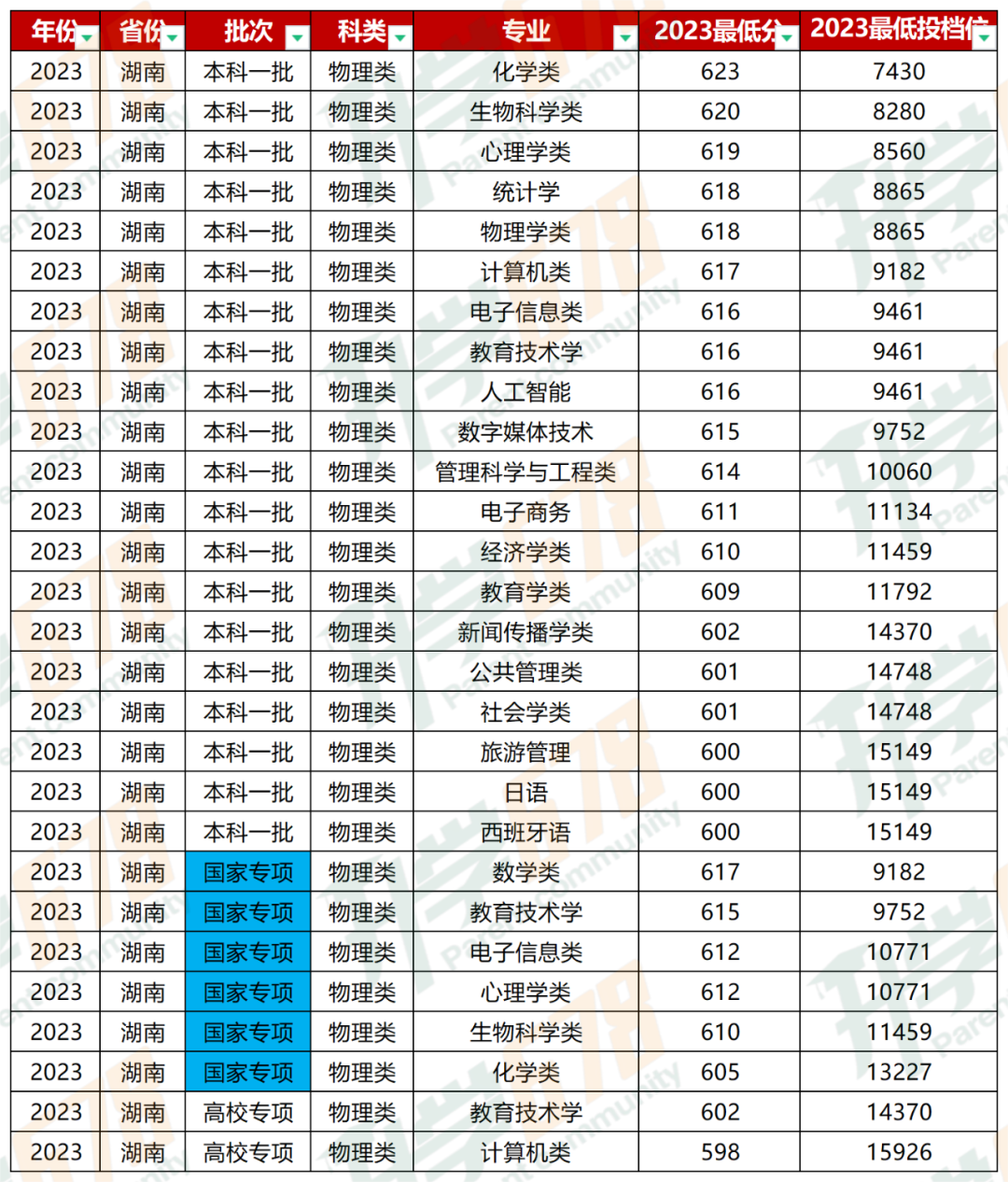 2023年华中师范大学在湖南物理类本科批录取最低分600分,对应位次15149,对应专业为西班牙语、日语、旅游管理;国家专项最低分605分,对应位次13227,对应专业化学类;高校专项最低分598,对应位次15926,对应专业计算机类。