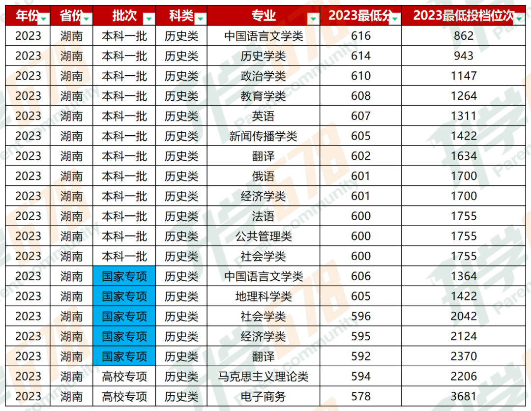2023年华中师范大学在湖南历史类本科批录取最低分600分,对应位次1755,对应专业社会学类、公共管理类、法语;国家专项最低录取分592,对应位次2370,对应专业为翻译;高校专项最低录取分578,对应位次3681,对应位次电子商务。