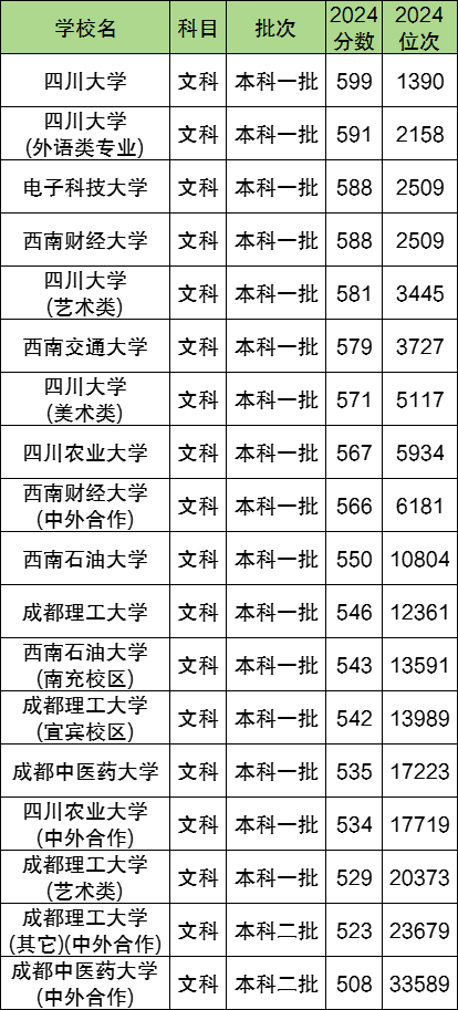 2024年四川双一流大学文科本科二批最低录取分数线是457分,收分最低的学校是成都中医药大学(中外合作),最低分508,对应最低位次是33589名。也就是说对于文科考生来说,高考成绩最低需要高于本科二批线51分,省排位在33589名以内才有机会上双一流大学。