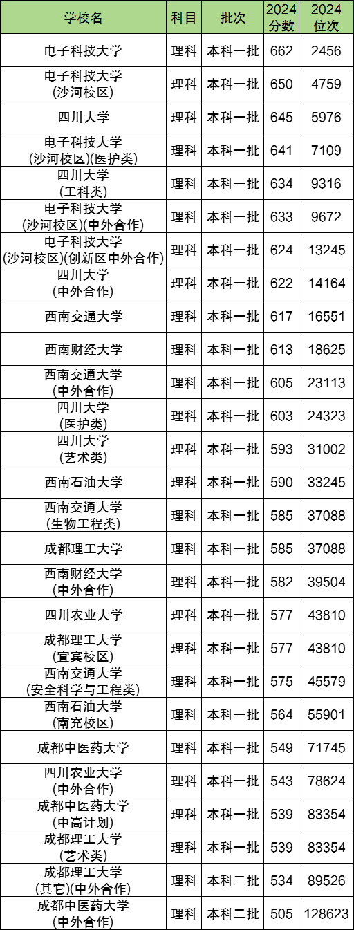 2024年四川双一流大学理科本科二批最低录取分数线是459分,收分最低的学校是成都中医药大学(中外合作),最低分505,对应最低位次是128623名。也就是说对于理科考生来说,高考成绩最低需要高于本科二批线46分,省排位在128623名以内才有机会上双一流大学。