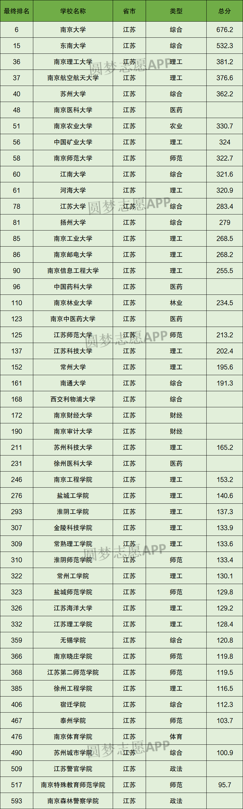 南京大学(最低637分)、东南大学(最低617分)、南京农业大学(最低581分)、中国药科大学(最低578分)、南京航空航天大学(最低574分)、南京理工大学(最低574分)、陆军工程大学(最低571分)、河海大学(最低571分)、苏州大学(最低564分)、江南大学(最低562分)。
