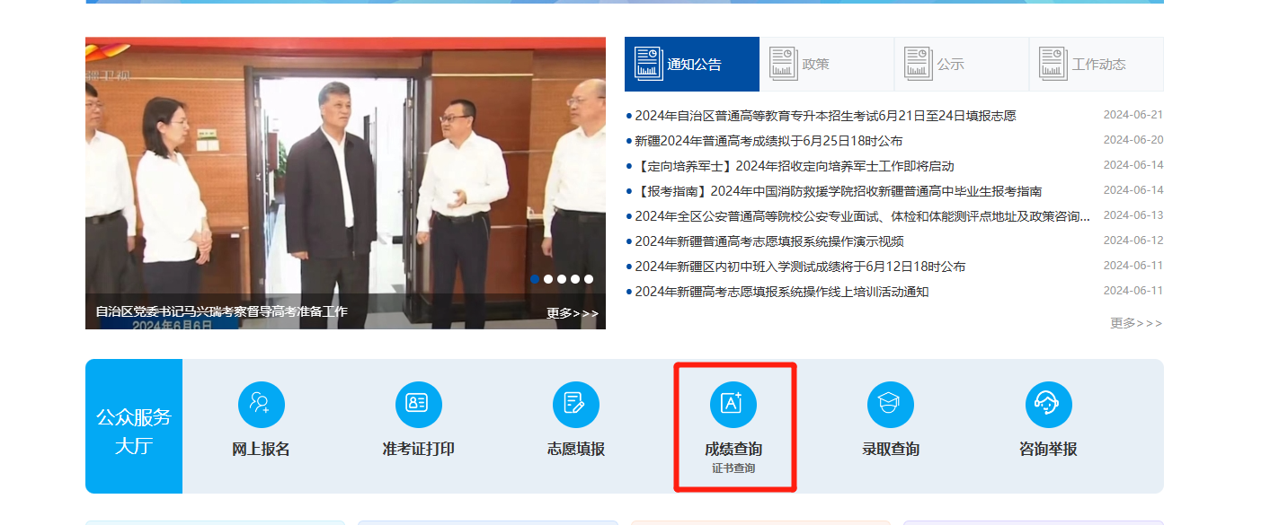 新疆省的高考成绩也将在6月24日公布,同学们可通过“新疆维吾尔自治区教育考试院”官网查询成绩,考生进入网站后,在首页下方的公众服务大厅”栏目中选择“成绩查询”,再点击“新疆普通高考成绩查询”的选项(该通道在高考成绩公布后开通)。