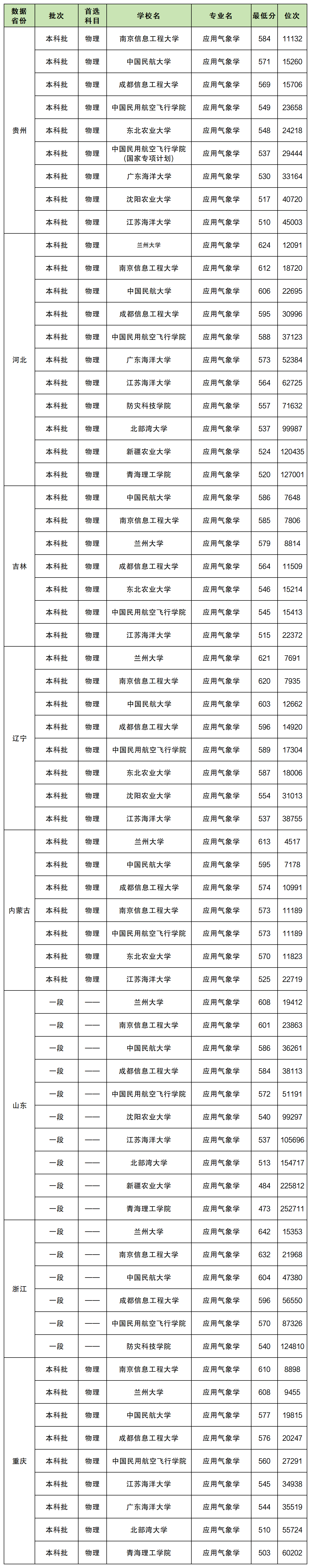 2025年气象学专业在浙江录取分数中,最难考的大学是兰州大学,分数是642分,位次排第15353名;最好考、分数最低的是防灾科技学院,分数为540分,录取位次为124810名。