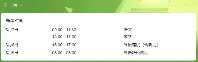 上海2025年高考时间安排在6月7日-6月9日,全国统考科目(语文、数学、外语)考试时间与其余省份一致,在6月7日-8日;