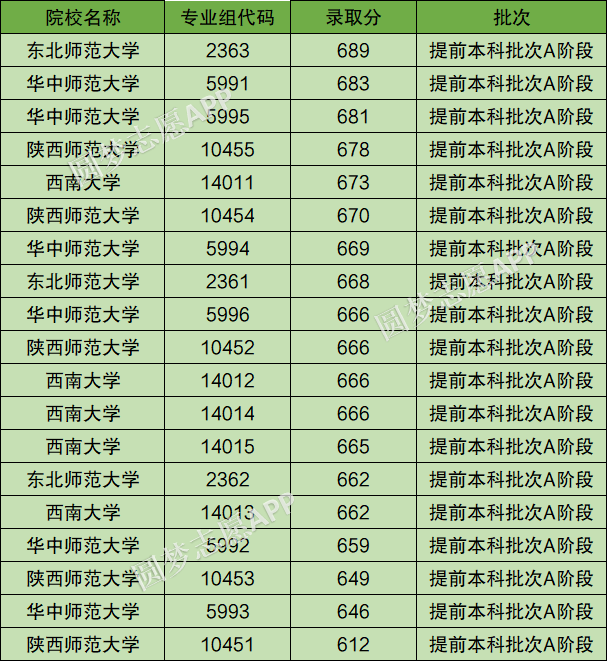 东北师范大学 : 662 分、华中师范大学 : 646 分、陕西师范大学 : 612 分、西南大学:662分。