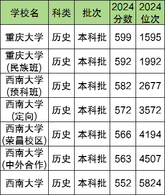 2024年重庆双一流大学历史类最低录取分数线是428分,收分最低的学校是西南大学,最低分552,对应最低位次是5824名。也就是说对于历史类考生来说,高考成绩最低需要高于本科线124分,省排位在5824名以内才有机会上双一流大学。