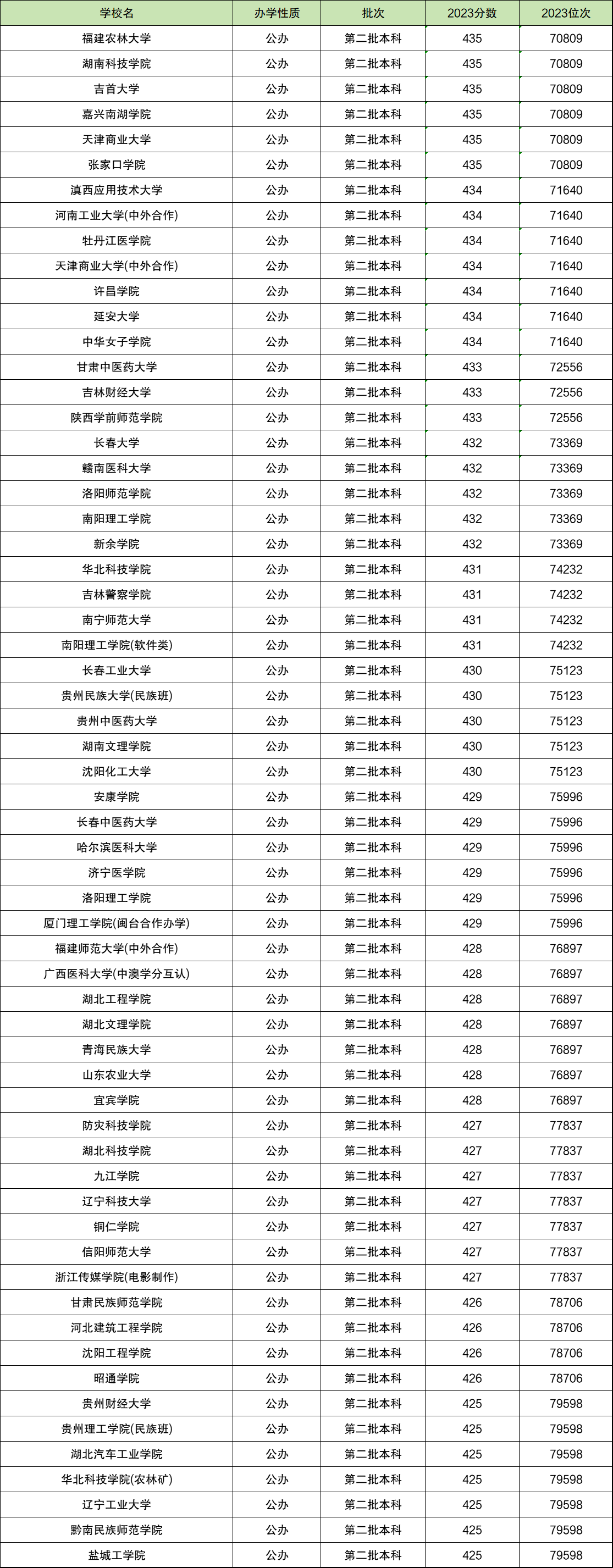 分数最高为福建农林大学、湖南科技学院、吉首大学、嘉兴南湖学院、天津商业大学、张家口学院,均为435分,对应位次70809位。