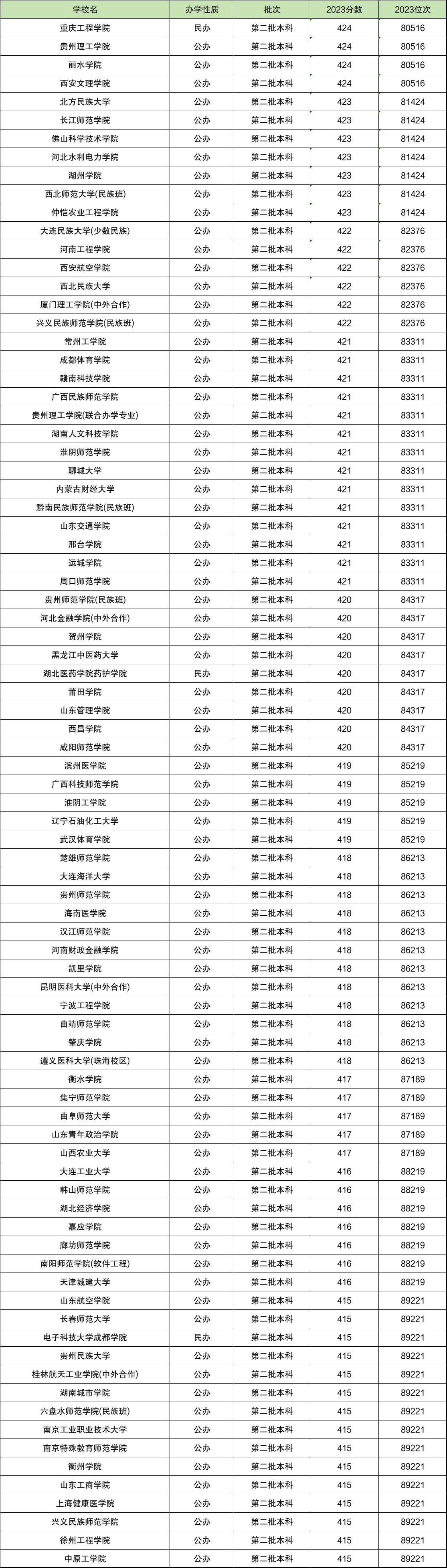 分数最低为贵州财经大学、贵州理工学院(民族班)、湖北汽车工业学院、华北科技学院(农林矿)、辽宁工业大学、黔南民族师范学院、盐城工学院,均为425分,对应位次79598位。