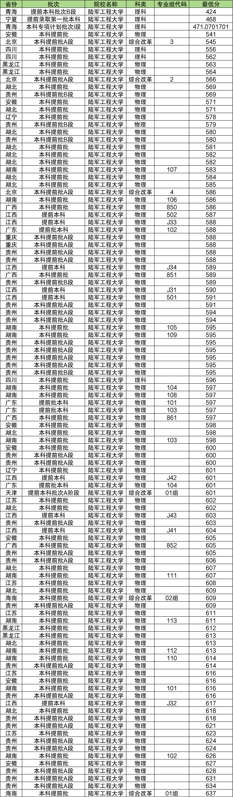 陆军工程大学只在本科提前批招生,在各省的录取分数线为:424分-637分。