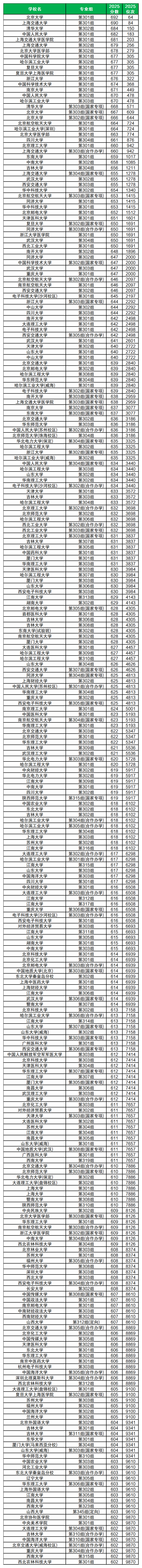 2025山西物理类高考位次排名对应学校为:676分对应位次322位,对应浙江大学(301组);620分对应位次5728位,对应华北电力大学(303组)、哈尔滨工程大学(301组),更多位次对应大学名单详见下文。