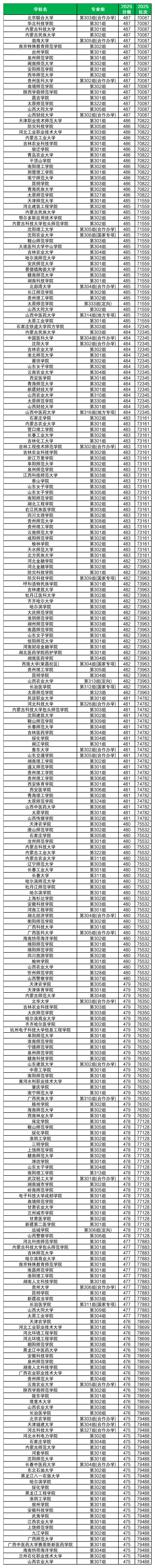 分数最高有华北科技学院(301组)、内蒙古科技大学(301组)、内蒙古民族大学(302组)、台州学院(301组)、泉州师范学院(301组)、闽南师范大学(302组)等,均为487分,对应位次70087位。