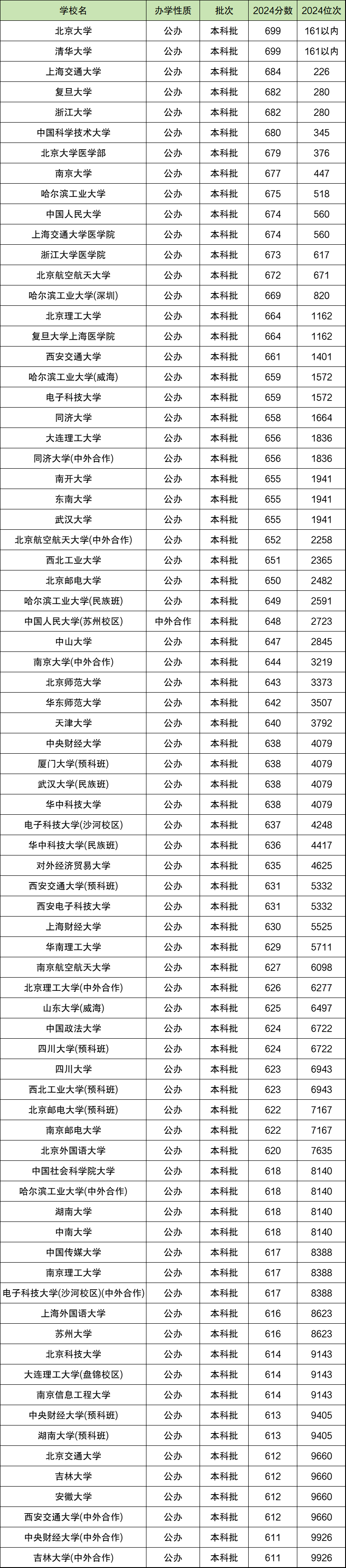 根据重庆省2024年全国大学录取分数线可知,在1万名之前的物理类考生能上的学校有76所,对应的分数为699~611分,对应位次为161以内~9926位。
