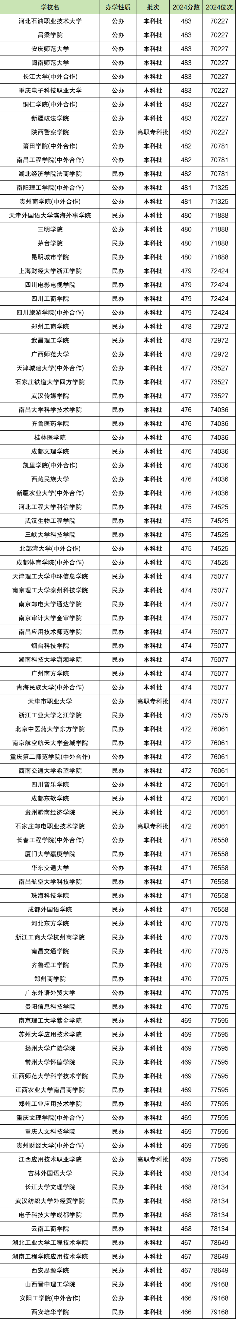 在7万-8万名之间的物理类考生能上的学校有94所,对应的分数为483分~466分,对应位次为70227~79168位。