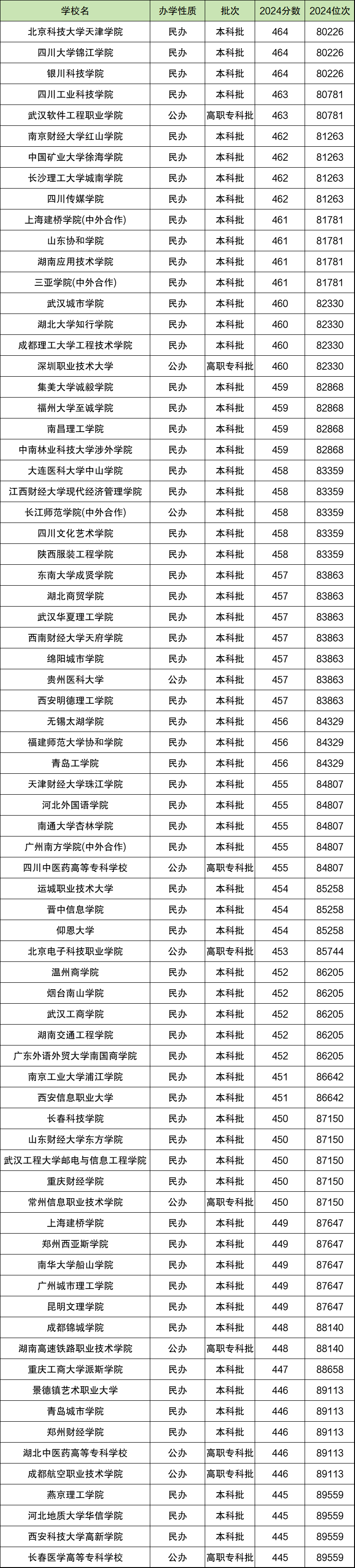 在8万-9万名之间的物理类考生能上的学校有74所,对应的分数为464分~445分,对应位次为80226~89559位。