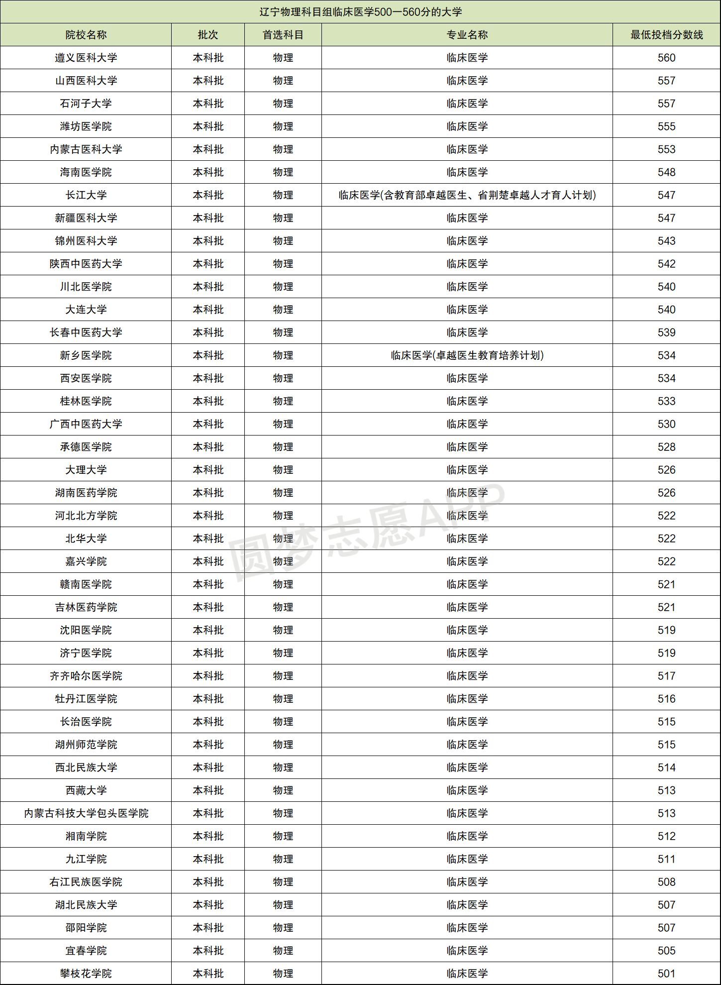 由于各医科大学的临床医学专业都不在辽宁的历史科目组招生,所以小编就为大家整理出辽宁物理科目组500-560分的临床医学大学。