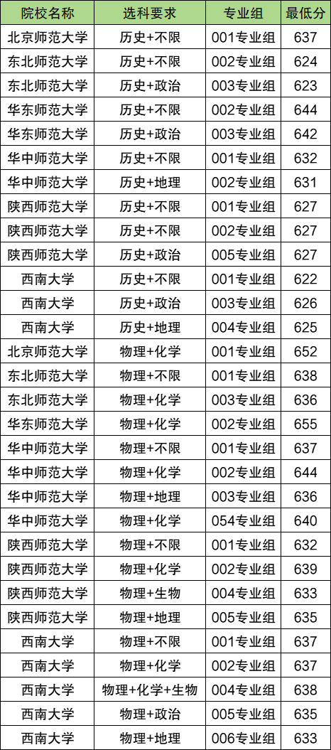 最低分的公费师范生院校及专业是:陕西师范大学、001专业组,选科要求为物理+不限。