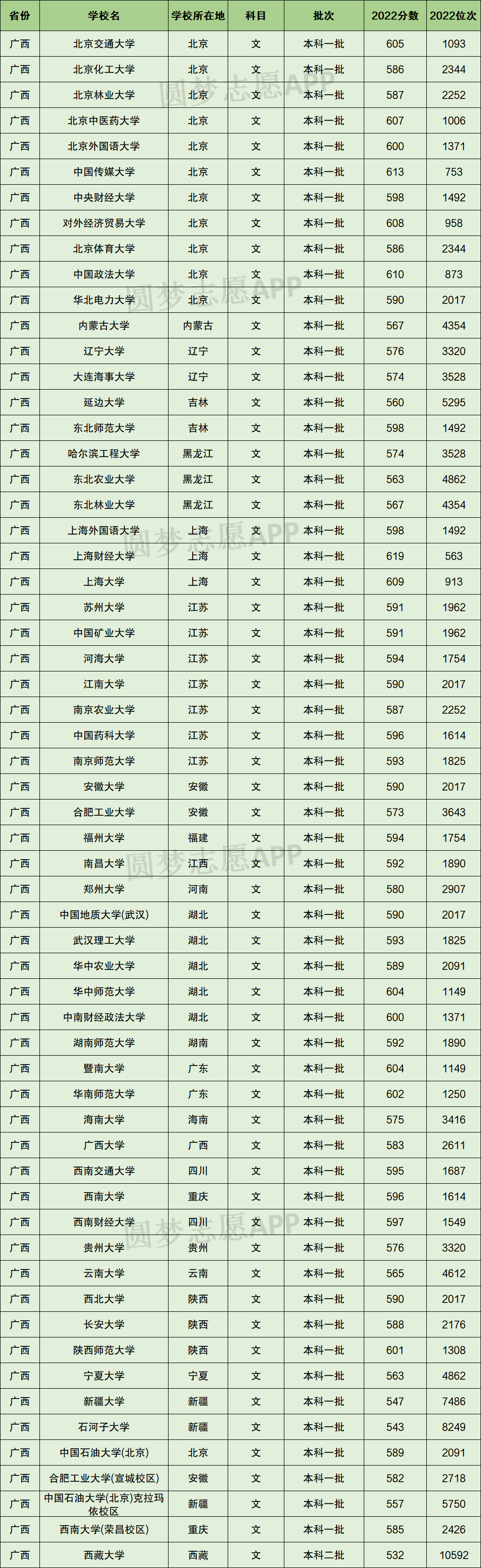 以下为2022年全国211大学在广西文科录取分数线。