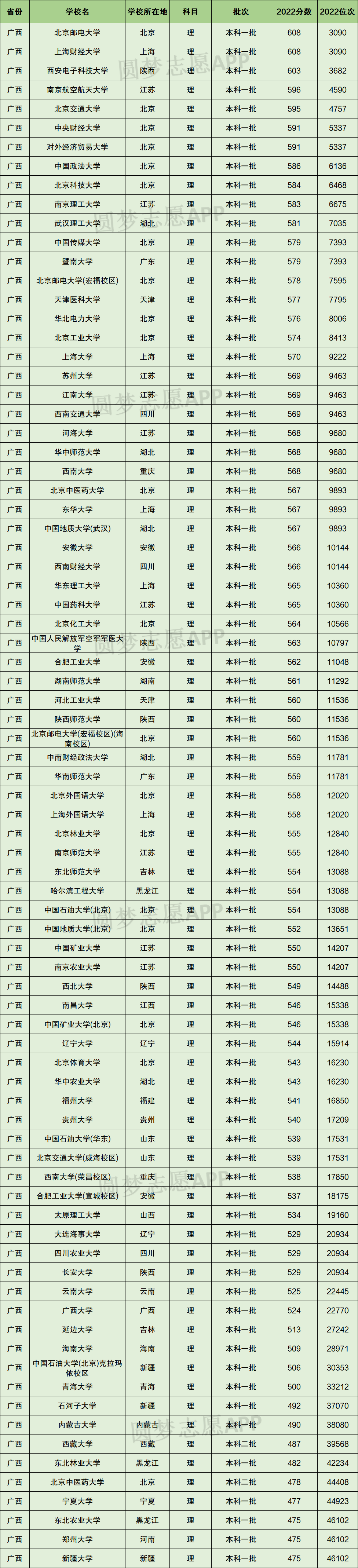 以下为2022年全国211大学在广西理科录取分数线。