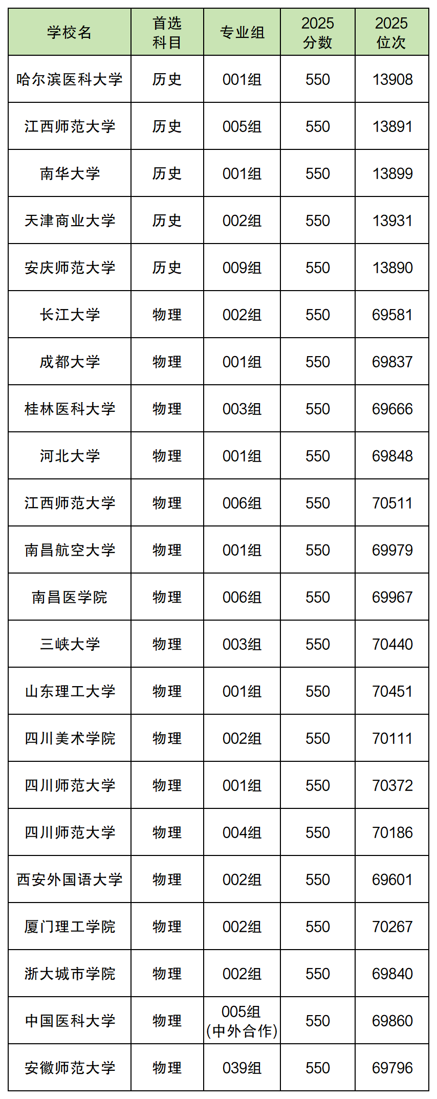 安徽高考录取分数线在550分左右的公办大学专业组一共有22个,其中历史组有:哈尔滨医科大学(001组)、江西师范大学(005组)、南华大学(001组)、天津商业大学(002组)、安庆师范大学(009组)5个专业组,物理组有长江大学(002组)、河北大学(001组)、安徽师范大学(039组)等17个专业组。