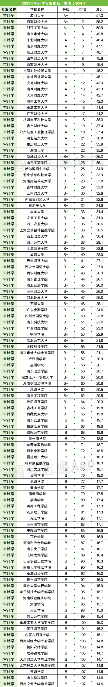 为了让同学们了解审计学实力强劲的院校有哪些,在此整理了2023年审计学专业的院校排名人,如下: