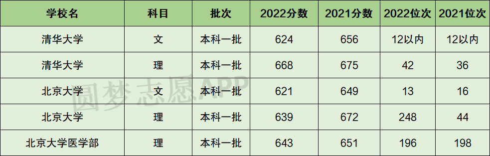 根据内蒙古教育考试院公布的2022年内蒙古高考本科批分数线,圆梦志愿为大家整理了清华大学、北京大学在内蒙古的所有分数线,以及清华大学、北京大学近两年在内蒙古的录取位次。具体数据见下图:
