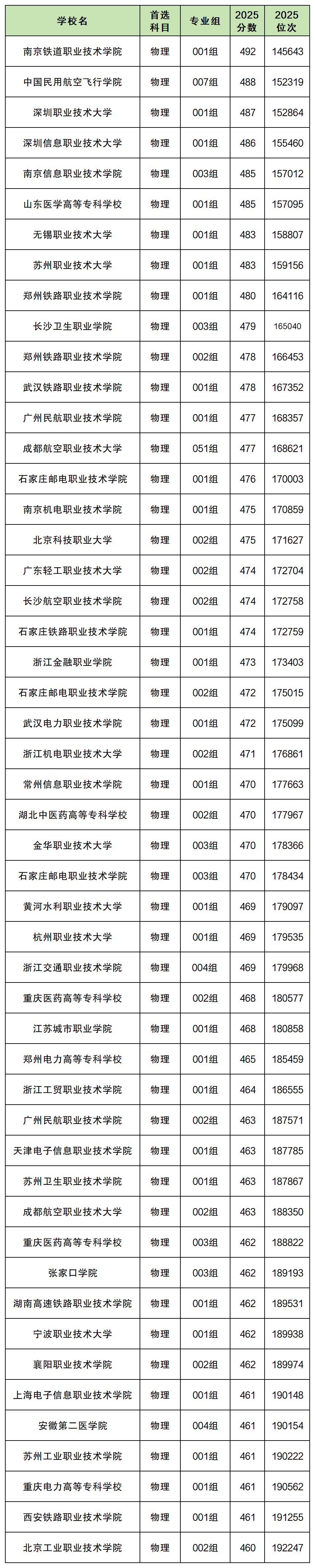 以下是2025年安徽物理类公办专科院校录取分数TOP50: