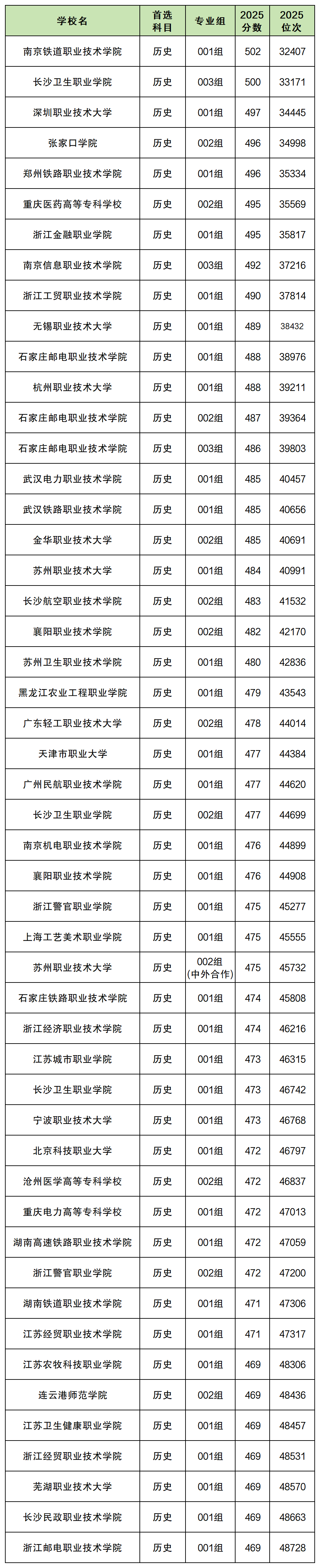 以下是2025年安徽历史类公办专科院校录取分数TOP50: