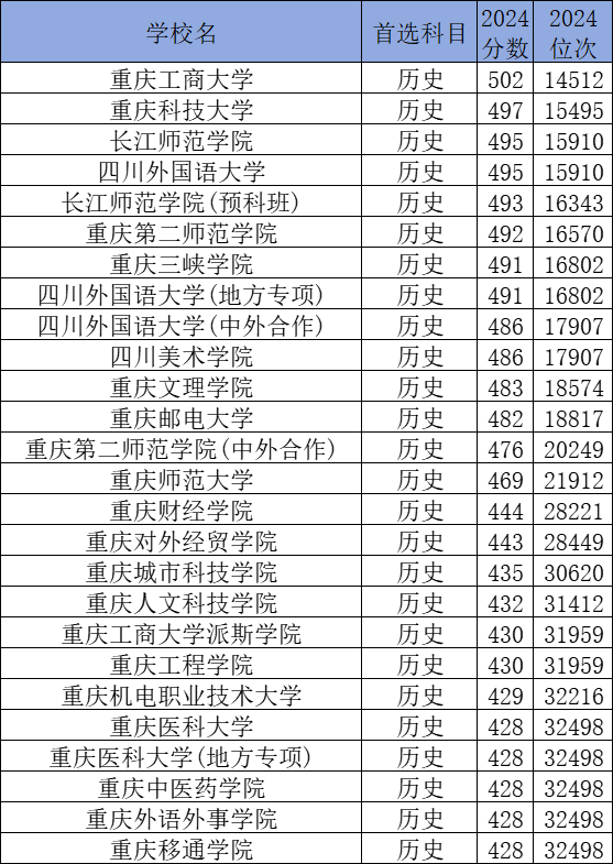 以下为2024年重庆市内历史类所有二本大学分数线: