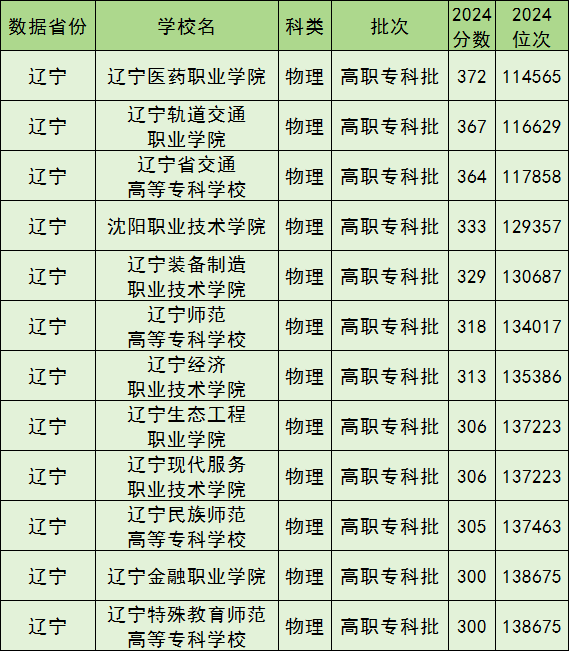 下面是2024年沈阳市公办大专院校分数线排名物理类一览表: