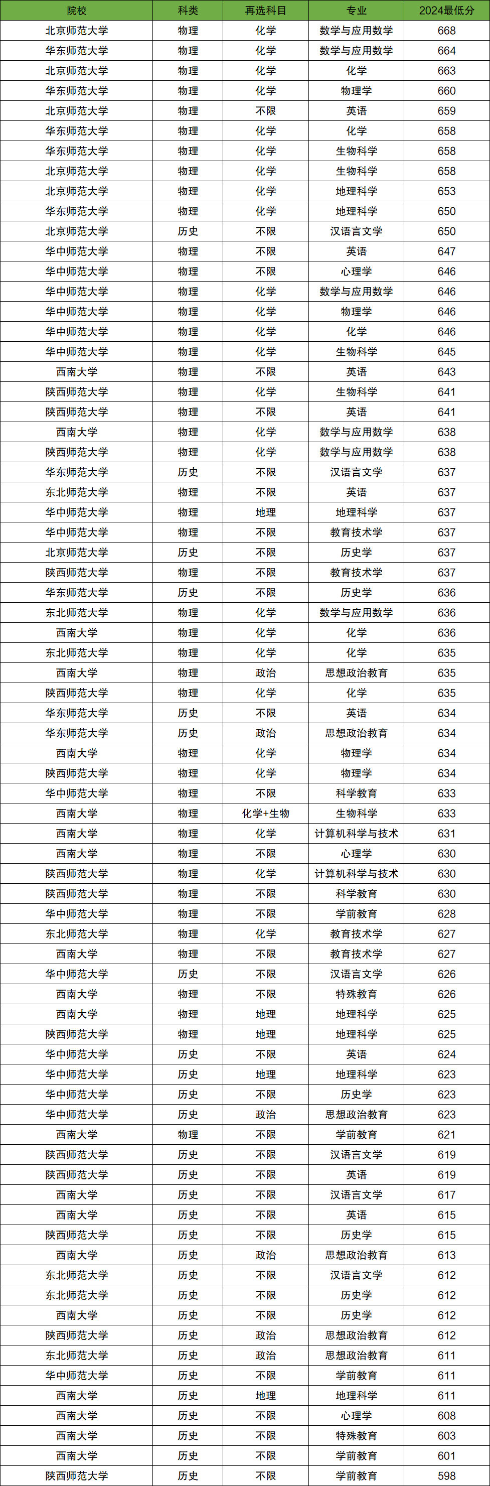 除此之外还有西南大学、北京师范大学、陕西师范大学等,下表为具体学校名单及分数线。