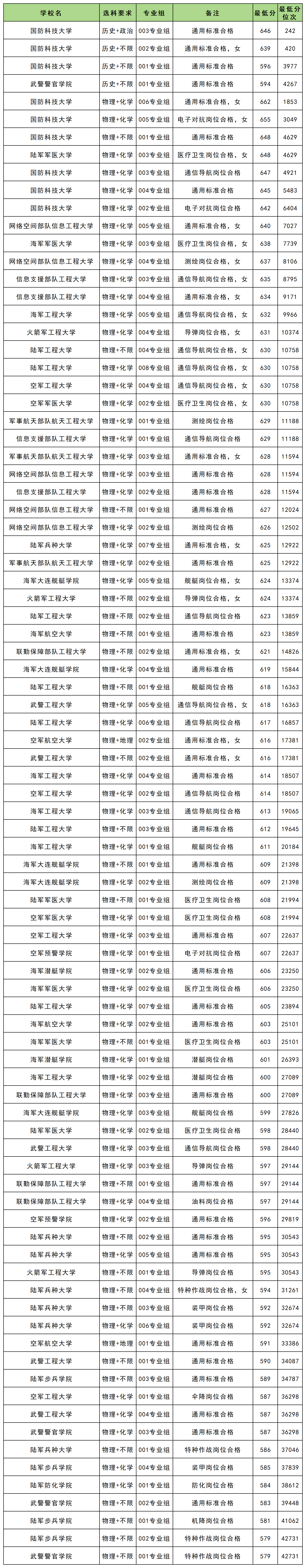 2025年在安徽省物理类分数线最高的军校是国防科技大学006组(通用标准合格,女),录取分数线662分,最低位次1853名。录取分数线最低的军校是陆军步兵学院002组(特种作战岗位合格)和武警警官学院001组(特种作战岗位合格),录取分数线579分,最低位次42731名。