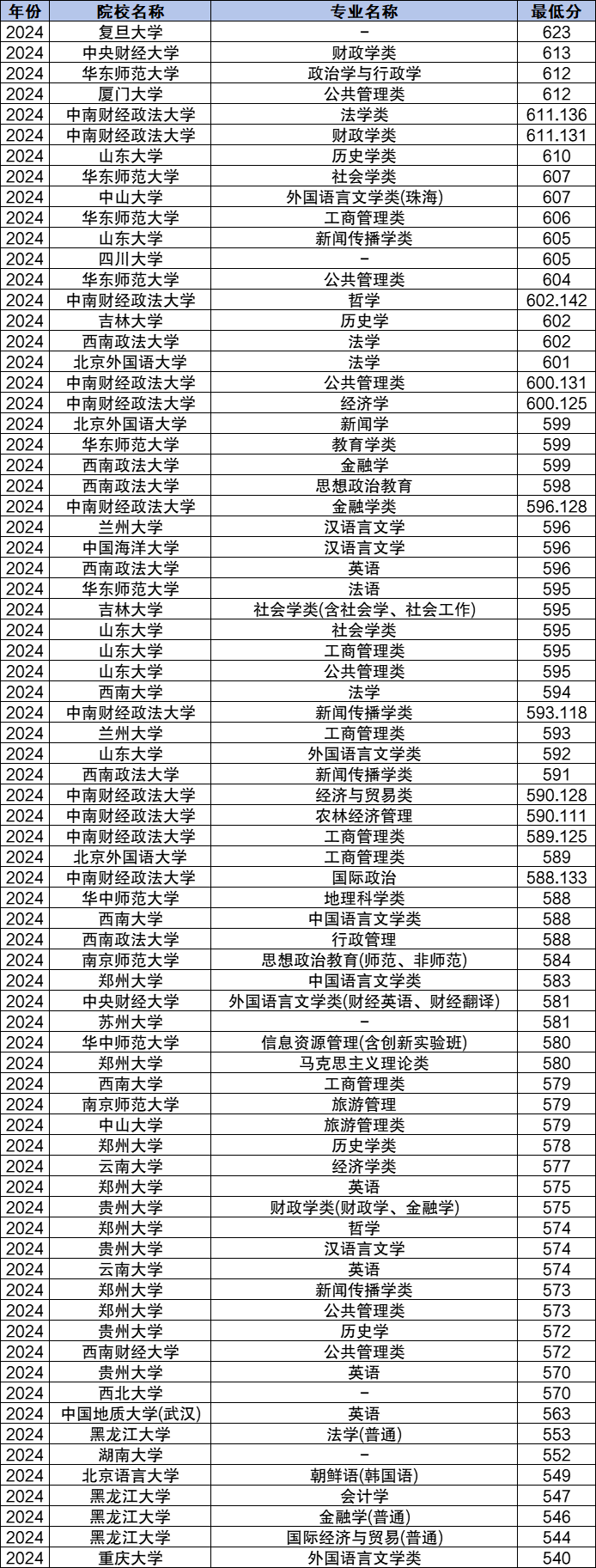 2024年各大学高校专项计划在河南文科的录取分数线在540分-623分之间,最难考且录取分数最高的是复旦大学,最低分为623分;相对好考且录取分数最低的是重庆大学,最低分为540分,录取专业为外国语言文学类。