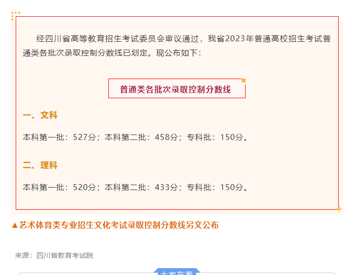四川省2023年普通高校招生考试普通类各批次录取控制分数线已划定,2023年四川高考录取分数线为: